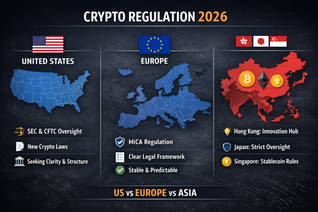 EU waxay leedahay MiCA oo fully applicable ah tan iyo 30 December 2024 kii, UK-ka waxay dejisay timetable cusub, halka US 2026 ka ay ku socoto clarifying interpretation iyo harmonization. Asia-ka waxay si xooggan uga shaqeyneysaa frameworks rasmi ah, gaar ahaan Hong Kong, Japan, iyo Singapore.