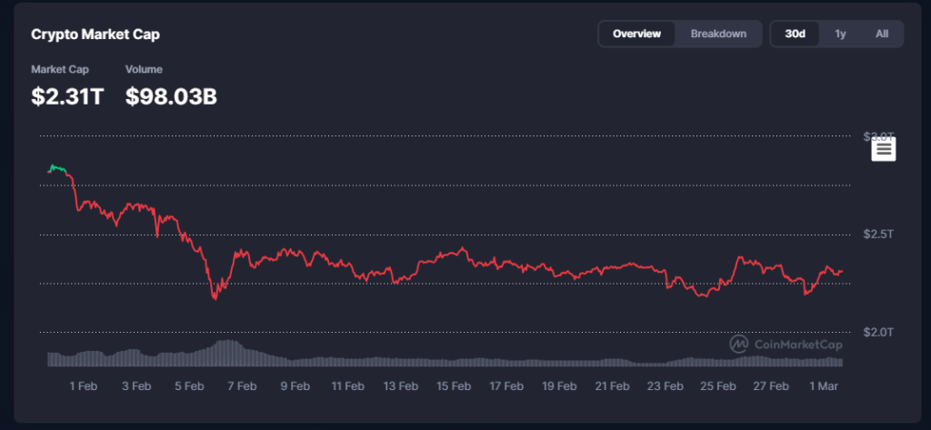 Market Cap ka guud ee suuqa waxuu joogaa maanta $2.31 trillion, halka (Volume) hantida guud ee suuqa la isku dhaafsaday 24 saac u dambaysay ay gaarayso 98.03 billion