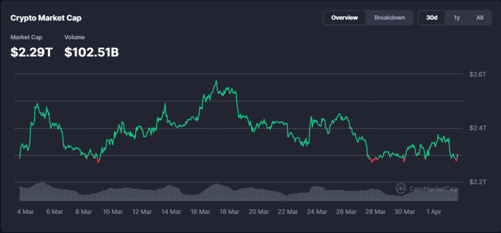 Market Cap ka guud ee suuqa waxuu joogaa maanta $2.29 trillion, halka (Volume) hantida guud ee suuqa la isku dhaafsaday 24 saac u dambaysay ay gaarayso $102.51 billion.