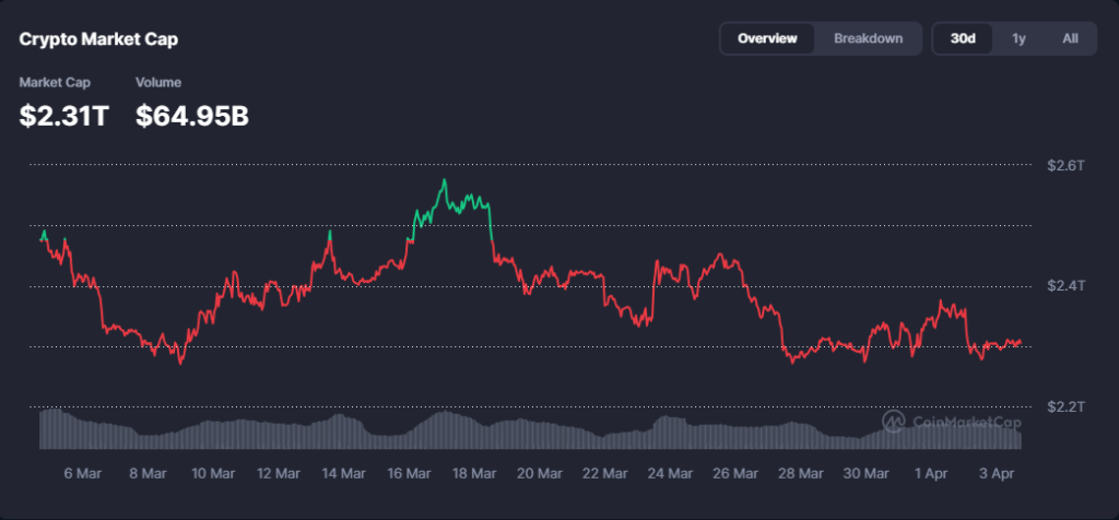 Market Cap ka guud ee suuqa waxuu joogaa maanta $2.31 trillion, halka (Volume) hantida guud ee suuqa la isku dhaafsaday 24 saac u dambaysay ay gaarayso $64.95 billion.