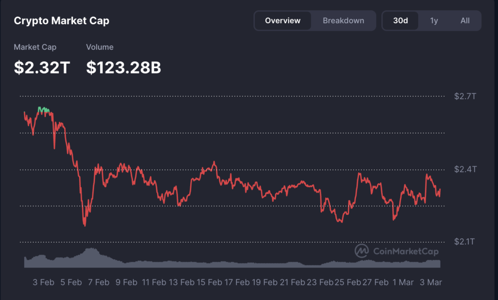 Market Cap ka guud ee suuqa waxuu joogaa maanta $2.32 trillion, halka (Volume) hantida guud ee suuqa la isku dhaafsaday 24 saac u dambaysay ay gaarayso 123.28 billion.