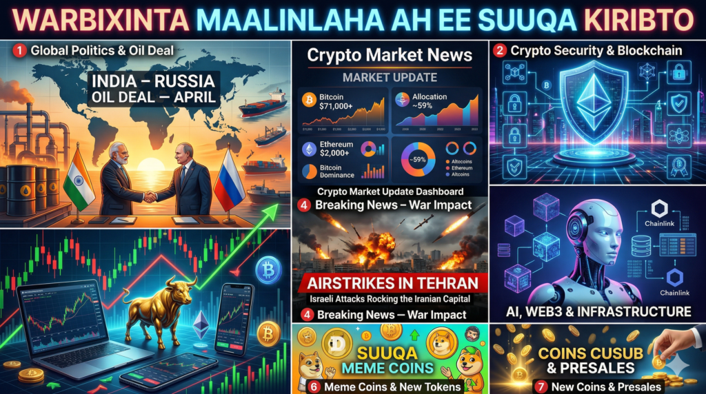 Wararka guud ee maanta sidoo kale waxay muujinayaan risk-on mood yar oo ka muuqda suuqyada ballaaran. Reuters waxay sheegtay in suuqyada caalamiga ahi kor u socdeen iyadoo rajada ka dhalatay de-escalation-ka Bariga Dhexe ay keentay in saliiddu hoos u dhacdo, taasna ay caawisay dareenka maalgashiga. Investopedia-na waxay sheegtay in Bitcoin uu ka soo kabanayo oo uu kor uga maray $71,000 maanta.
