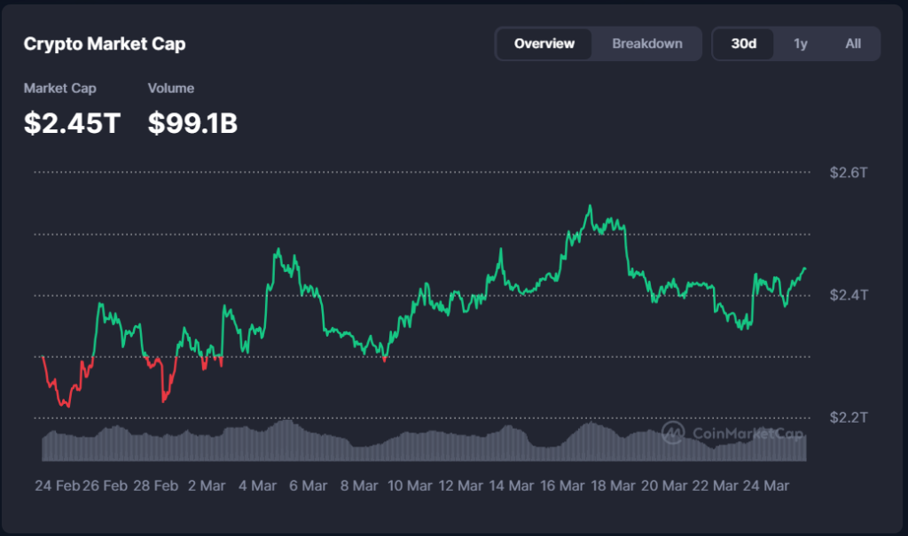 Market Cap ka guud ee suuqa waxuu joogaa maanta $2.45 trillion, halka (Volume) hantida guud ee suuqa la isku dhaafsaday 24 saac u dambaysay ay gaarayso $99.1 billion.