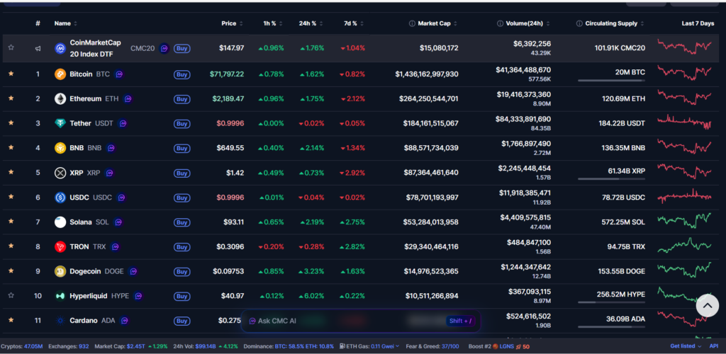 Suuqa crypto weli Bitcoin ayaa hoggaaminaya. CoinMarketCap wuxuu muujinayaa in BTC dominance-ku yahay 58.5%, halka ETH dominance-ku yahay 10.7%. Isla xogtaas live-ka ah waxay sidoo kale tilmaamaysaa in suuqa crypto guud ahaan uu gaarayo $2.45 trillion, iyadoo 24-saac gudahood volume-ku yahay $99.89 billion, ayna CMC Fear & Greed Index-ku taagan yahay 36/100. Taasi waxay muujinaysaa suuq wali taxaddar leh, balse aan si buuxda u jabin.