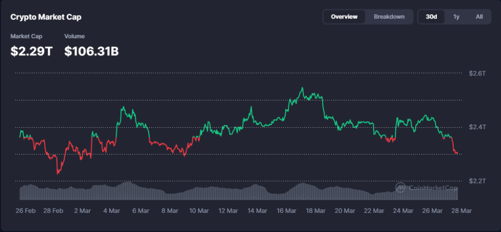 Market Cap ka guud ee suuqa waxuu joogaa maanta $2.29 trillion, halka (Volume) hantida guud ee suuqa la isku dhaafsaday 24 saac u dambaysay ay gaarayso $106.31 billion.