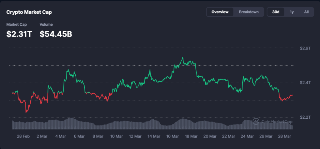 Market Cap ka guud ee suuqa waxuu joogaa maanta $2.31 trillion, halka (Volume) hantida guud ee suuqa la isku dhaafsaday 24 saac u dambaysay ay gaarayso $54.45 billion.