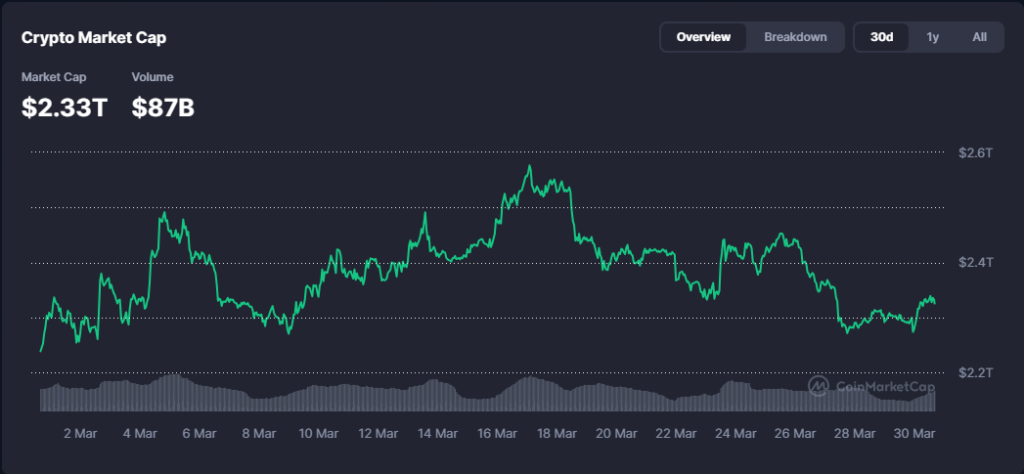 Market Cap ka guud ee suuqa waxuu joogaa maanta $2.33 trillion, halka (Volume) hantida guud ee suuqa la isku dhaafsaday 24 saac u dambaysay ay gaarayso $87 billion.