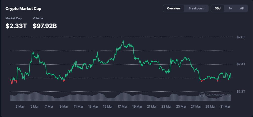 Market Cap ka guud ee suuqa waxuu joogaa maanta $2.33 trillion, halka (Volume) hantida guud ee suuqa la isku dhaafsaday 24 saac u dambaysay ay gaarayso $97.92 billion.