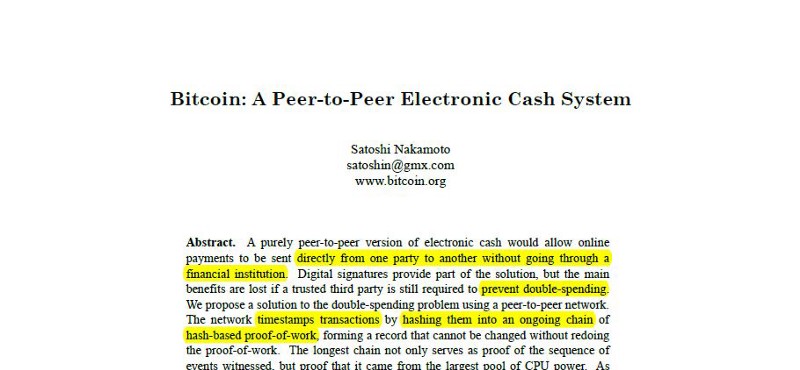 31 Oktoobar 2008, qof ama koox adeegsata magaca Satoshi Nakamoto ayaa soo saaray warqad cilmiyeed cinwaankeedu ahaa Bitcoin: A Peer-to-Peer Electronic Cash System. Warqaddan ma ahayn oo kaliya sharaxaad farsamo; waxay ahayd bayaan siyaasadeed oo si dadban u diidan nidaamka bangiyada dhexe.