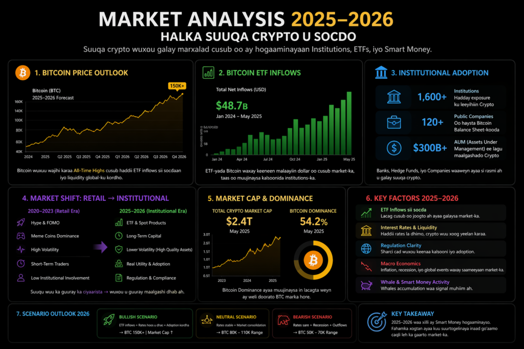 Fursadda ugu weyn waa inaad barato meesha lacagta waaweyn u socoto. Haddii ETF inflows ay kordhayaan, haddii corporate treasuries ay sii iibsanayaan, ama haddii Bitcoin uu helo support ka imanaya institutions, waxaad heli kartaa trend xooggan. sanadkii 2025 iyo 2026 ka waxay muujiyeen in smart money ay si muuqata u saameyso direction-ka suuqa.