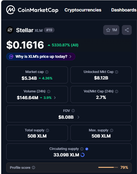 Marka la eego xogta suuqa ee hadda, XLM wuxuu ku dhow yahay $0.1616, market cap-kuna waa ku dhowaad $5.34B, iyadoo circulating supply-ku yahay 33.09B XLM. Total supply-ga iyo Max supply-ga CoinMarketCap waxay ku muujinayaan 50B XLM, taas oo muujinaysa in tokenomics-ku ay yihiin kuwo ka duwan qaar ka mid ah coins-ka leh supply aan xad lahayn ama inflation joogto ah.